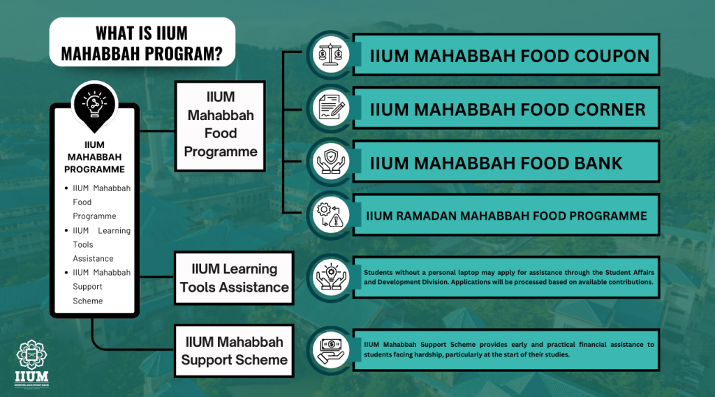 Apart from financial assistance, IIUM also provides the IIUM Mahabbah Programme for students who are in need, either they fall in the poor category or simply ran out of pocket money for the next meal, or having hardship for doing assessments. IIUM Mahabbah Programme was launched in February 2016 by IIUM President, Tan Sri Rais Yatim. It is an effort done to help the students of IIUM who are in need by providing them with free meals with additional laptop assistance (subject to availability). It is hoped that this can at least lessen the financial burden that the students are facing and help them to get the essential daily meals to keep them going and focused on their studies.