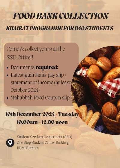 Among the key initiatives is the Food Bank Collection under the Khairat Programme for B40 students, coordinated by the Student Services Department (SSD). This programme provides essential food supplies to students facing financial hardship, helping them manage basic living needs while focusing on their studies. Students are able to collect food assistance at designated university offices by providing simple income verification documents, ensuring that support reaches those who need it most in a dignified and efficient manner.