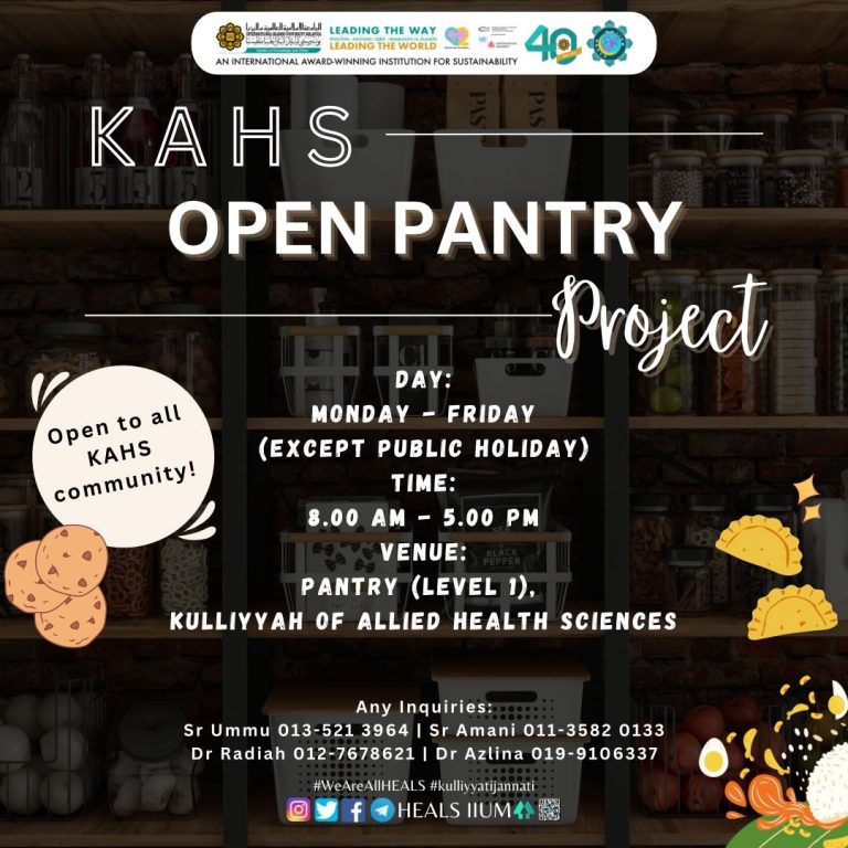 In addition to centralised food assistance schemes, IIUM also promotes community based welfare efforts at the kulliyyah level. The Kulliyyah of Allied Health Sciences (KAHS) Open Pantry Project is an example of grassroots support within the IIUM community. This initiative offers daily access to essential food items for students and staff, reflecting a culture of mutual care and solidarity. Operating on weekdays, the pantry provides an accessible and welcoming resource for those experiencing temporary or ongoing food insecurity.