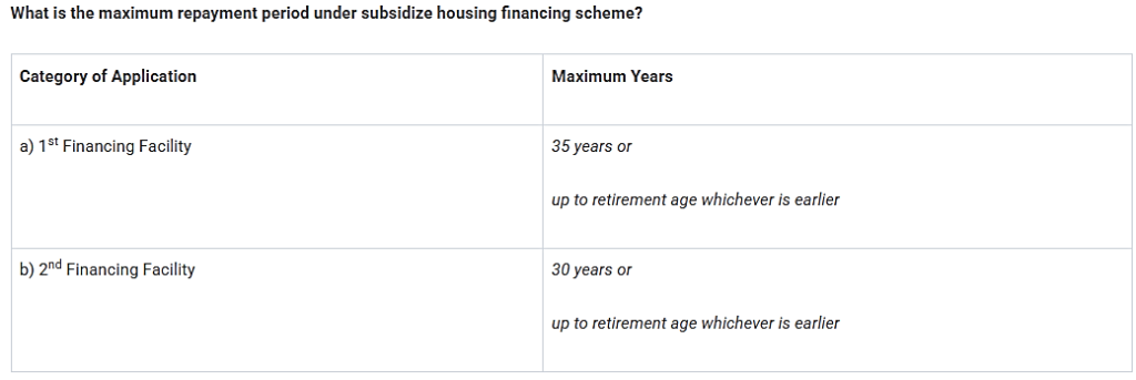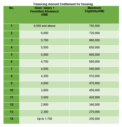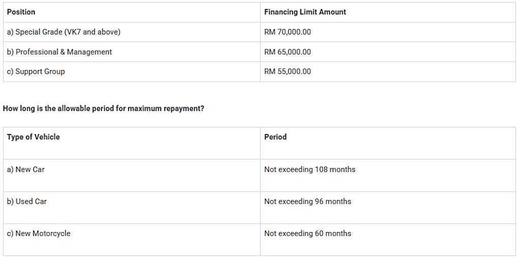 Eligible staff members (permanent or on contract status) may apply for these financing facilities subject to defined criteria. For example, under the computer financing scheme, the deduction must not exceed one-third of basic salary and the total deduction (including other deductions) must not exceed 60 % of basic salary plus monthly allowance; the maximum financing amount is RM 5,000 with a repayment period up to 48 months.