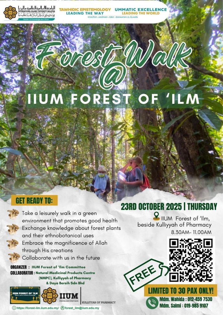 The Forest of ‘Ilm is an innovative living-laboratory initiative established by the Kulliyyah of Pharmacy, IIUM located on the Kuantan campus of IIUM. It comprises a designated secondary forest area adjacent to the Kulliyyah’s facilities and is developed to support teaching, learning, research and conservation of indigenous plant species. The name “Ilm” (knowledge) underscores the dual ambition of nurturing both natural ecosystem value and human intellectual growth.