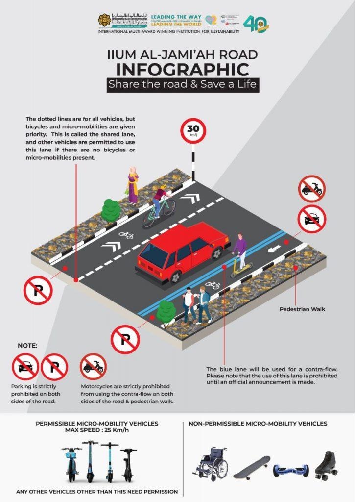 The implementation and enforcement of the use of this lane will be communicated later. Hence, this infographic serves as an initial notice regarding the guidelines and procedures for use along Al-Jami’ah Road when enforcement is carried out.