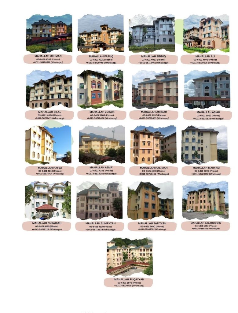 At International Islamic University Malaysia (IIUM)’s Gombak campus, the student residential colleges known as Mahallah are managed by Residential & Services Division (RSD) with the aim of providing more than just accommodation. The word Mahallah refers to a place where it is supposed to be a self-contained not only with services but also activities.  IIUM chooses to name its Mahallah after the leading companions of the Prophet S.A.W and the female Mujahidah and Syuhada. There are 17 Mahallah in Gombak Campus that accommodate about 17,000 students.