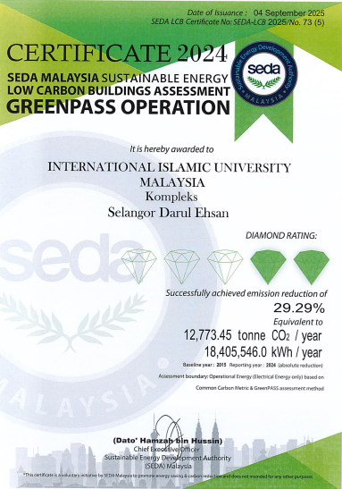 The International Islamic University Malaysia (IIUM) demonstrates strong leadership in low-carbon energy management through the Energy Savings Performance Project (ESPA) and its latest achievement in the Sustainable Energy Development Authority (SEDA) Malaysia GreenPASS Assessment 2024.