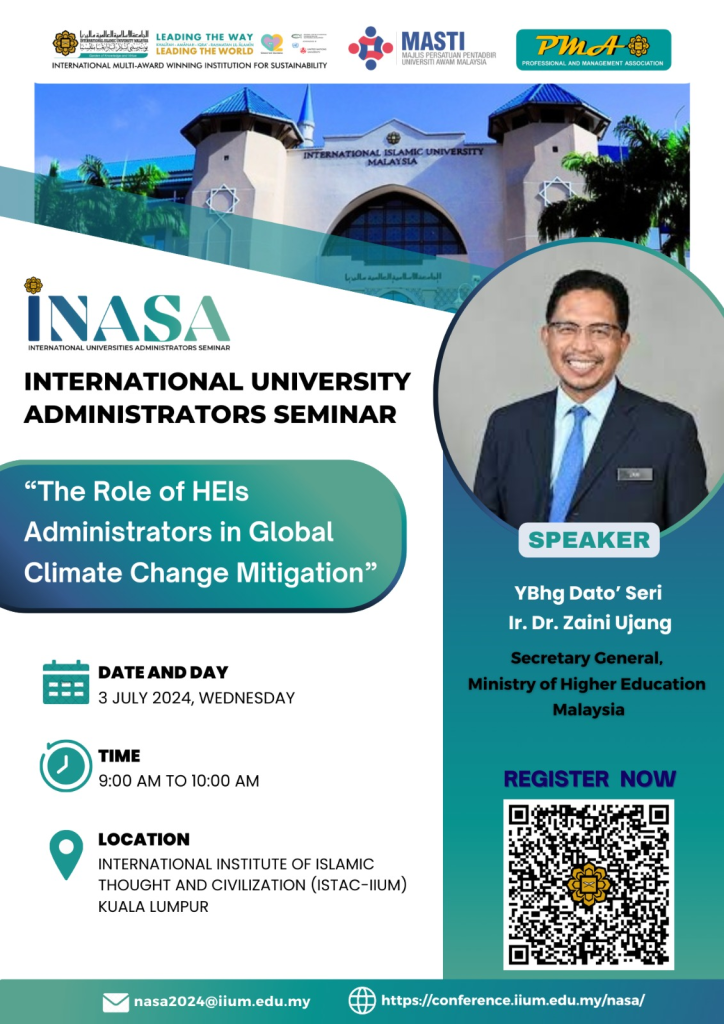 IIUM hosted the International University Administrators Seminar (iNASA 2.0) on 3–4 July 2024, themed “Empowering Administrators for Climate Change Mitigation in Higher Education Institutions.” Organised in partnership with the IIUM Professional and Management Association (PMA) and the Majlis Persatuan Pentadbir Universiti Awam (MASTI), the seminar brought together higher-education professionals, sustainability practitioners and policymakers to explore climate-change mitigation through digital innovation and community engagement. Sessions addressed sustainable campus infrastructure, policy advocacy, green digitalisation and the role of universities in advancing community-based climate resilience. The event promoted knowledge-sharing and capacity-building among Malaysian and regional institutions, fulfilling the indicator requirement for local education programmes on climate-change impacts, adaptation and mitigation.
