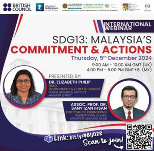 SDG 13: Malaysia’s Commitment and Actions Seminar (IIUM–ICESCO Chair) – awareness session (5 Dec 2024) with the British Council, University of Nottingham, and UKM for university students.