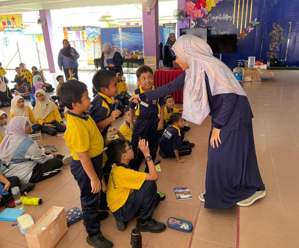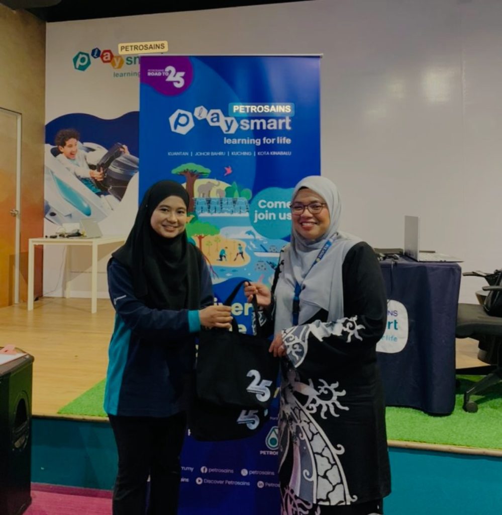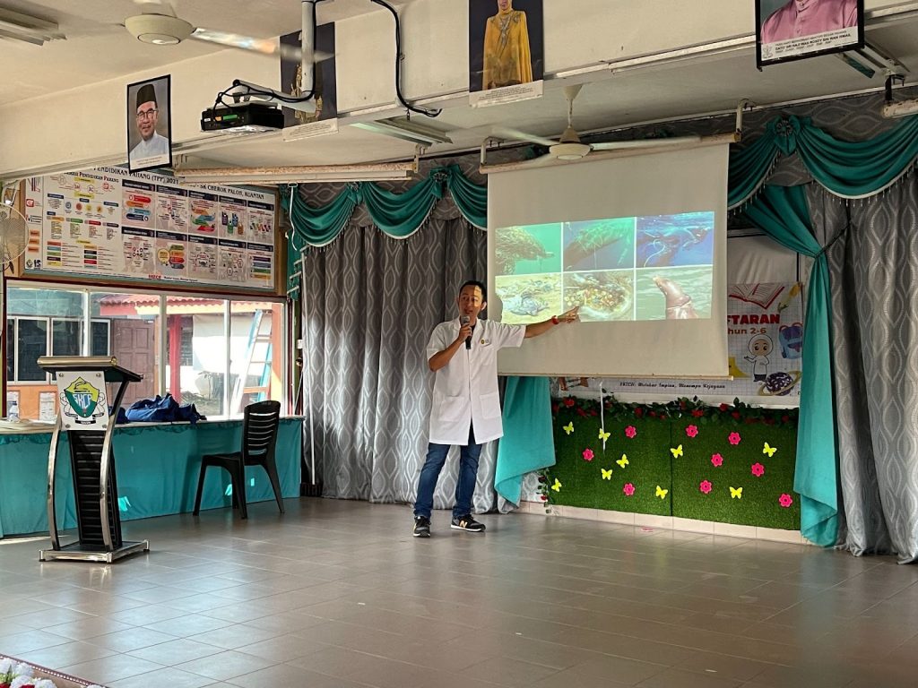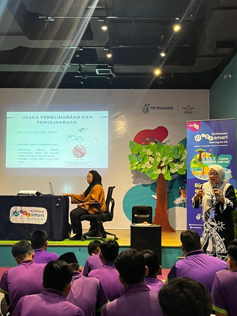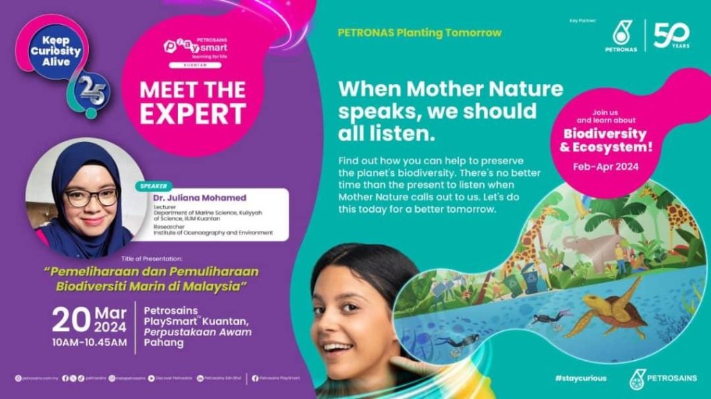 At Petrosains PlaySmart Kuantan, Dr Juliana Mohamed presented “Pemeliharaan dan Pemuliharaan Biodiversiti Marin di Malaysia” (20 March 2024), inspiring school audiences to explore coral-reef protection and sustainable marine practices.