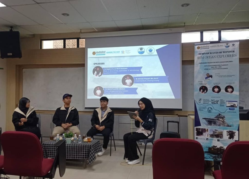 The Department of Marine Science hosted this seminar to share insights from the Malaysia–OceanX Scientific Expedition 2024. Advised by Dr Muhammad Faiz bin Mohd Hanapiah and presented by Dr Najatul Su Ad Abdullah, Dr Mohd Fuad Miskon and Aiman Hisyam Azmi, the session highlighted IIUM’s contributions to marine exploration, coral reef studies and ocean-mapping technologies. Talks and Q&A connected expedition research with classroom learning and inspired students to pursue ocean science and sustainability.