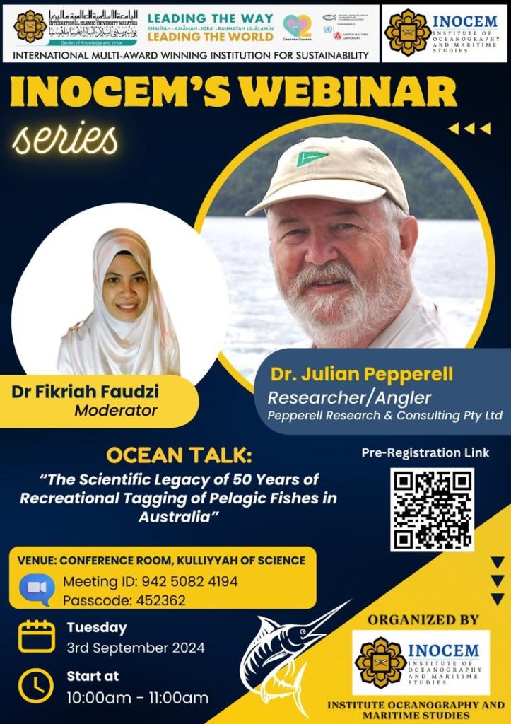 The INOCEM Seminar and Workshop Series (3 September 2024) featured Dr Julian Pepperell discussing “The Scientific Legacy of 50 Years of Recreational Tagging of Pelagic Fishes in Australia.” IIUM’s collaboration in the Royal Pahang Billfish International Challenge 2024, highlighted in Majalah 3 – “Memburu Layaran”, combined oceanography, fish-behaviour research and socio-economic analysis to support sustainable fisheries.