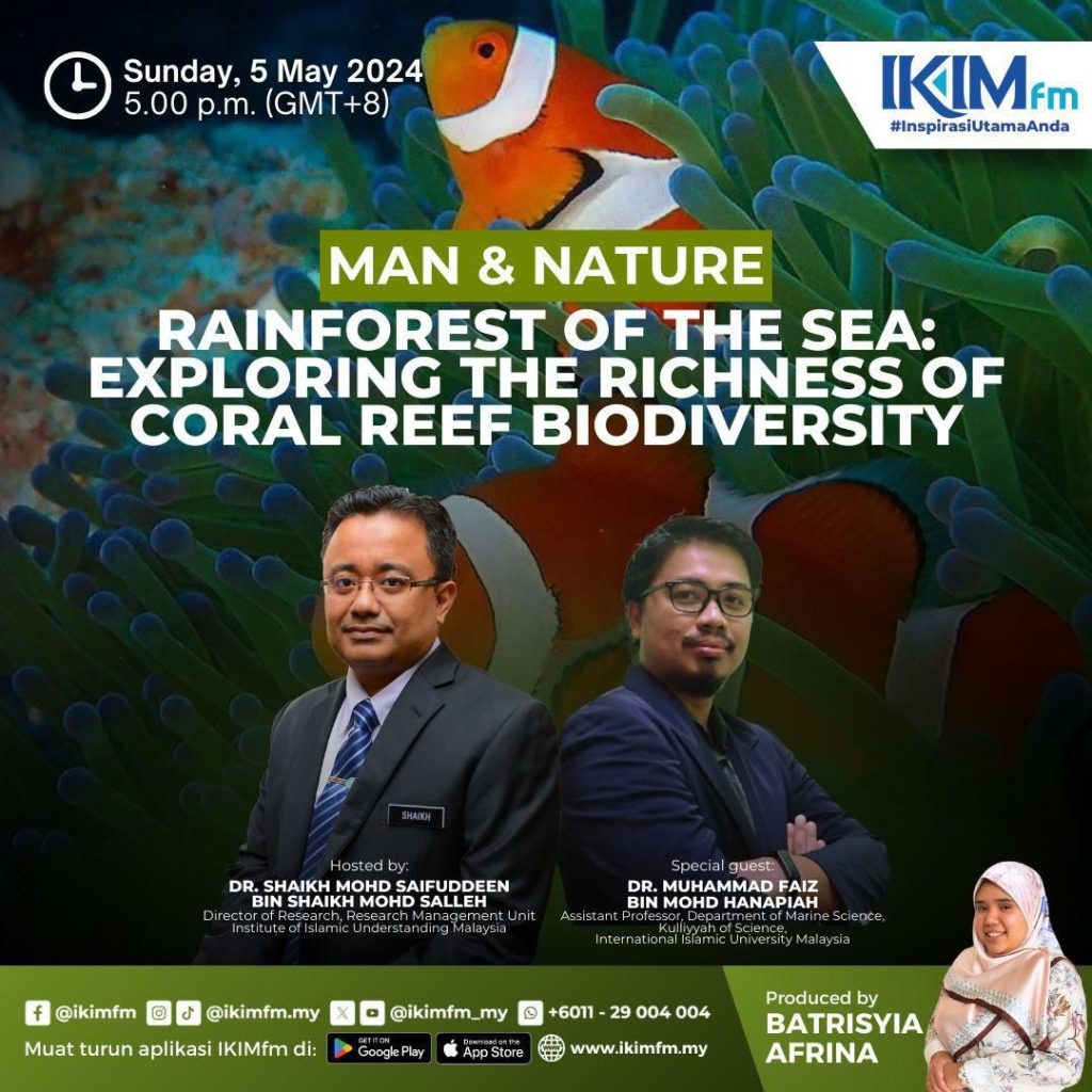 On 5 May 2024, Asst Prof Dr Muhammad Faiz bin Mohd Hanapiah appeared on IKIM.fm’s “Man and Nature” to discuss Malaysia’s coral ecosystems and the ecological services they provide. The talk covered coral reef conservation, threats from pollution and climate change, and the importance of public participation in protection efforts.
