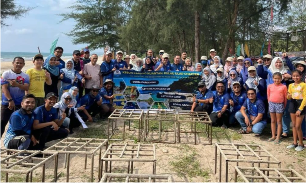 The Kebun Karang Kuantan project, active since 2023, focuses on coral-garden restoration with local community participation, rebuilding nearshore reef ecosystems and strengthening environmental awareness.