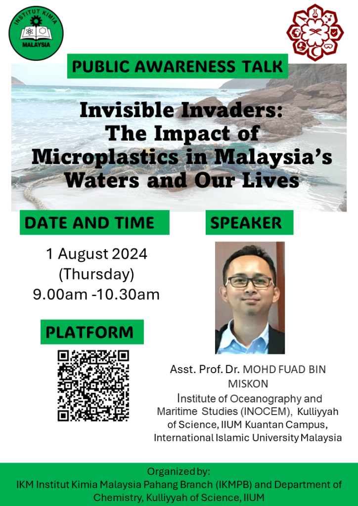 On 1 August 2024, Assoc Prof Dr Mohd Fuad bin Miskon of INOCEM, IIUM Kuantan, delivered a public awareness talk organised by the Institut Kimia Malaysia, Pahang Branch, in collaboration with the Department of Chemistry, Kulliyyah of Science. The online session explained sources, impacts and mitigation of microplastic pollution in accessible terms to broaden public understanding.