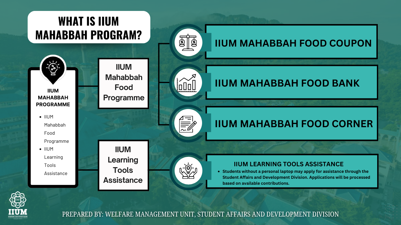 The IIUM Mahabbah Programme, overseen by the Welfare Management Unit within STADD, provides structured support for students facing financial hardship or food-insecurity. According to the programme page, eligible students may access: