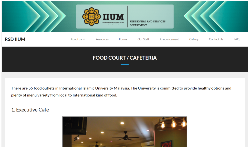 IIUM’s Residential and Services Department (RSD) webpage “Food Court / Cafeteria” states that the university has 55 campus food-outlets and is “committed to provide healthy options and plenty of menu variety from local to international kinds of food”. This includes vegetarian/plant-based-friendly meals, halal certification, and different cultural cuisines. Although the page does not label itself 2024 explicitly, it forms part of IIUM’s operating-menu information for students and affirms the university’s institutional commitment to providing sustainable and diverse food choices on campus.