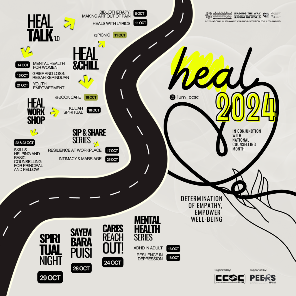 In 2024, IIUM strengthened its commitment to student well being through a series of mental health programmes and services spearheaded by the Counselling and Career Services Centre (CCSC). The university organised initiatives such as the “IIUM Mental Health Roundtable Discussion 2024” (26 February 2024) and “HEAL 2024: Holistic Engagement for Awareness and Living” (October 2024), focusing on dialogue, education, and collective healing within the IIUM community. These events engaged students, staff, and mental health professionals in open discussions on emotional wellness, stress management, and the Islamic perspective on self care and compassion.