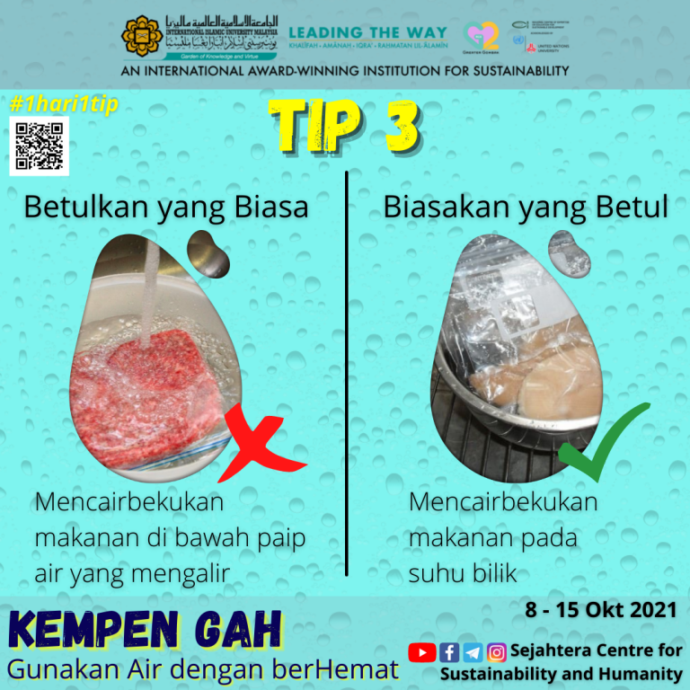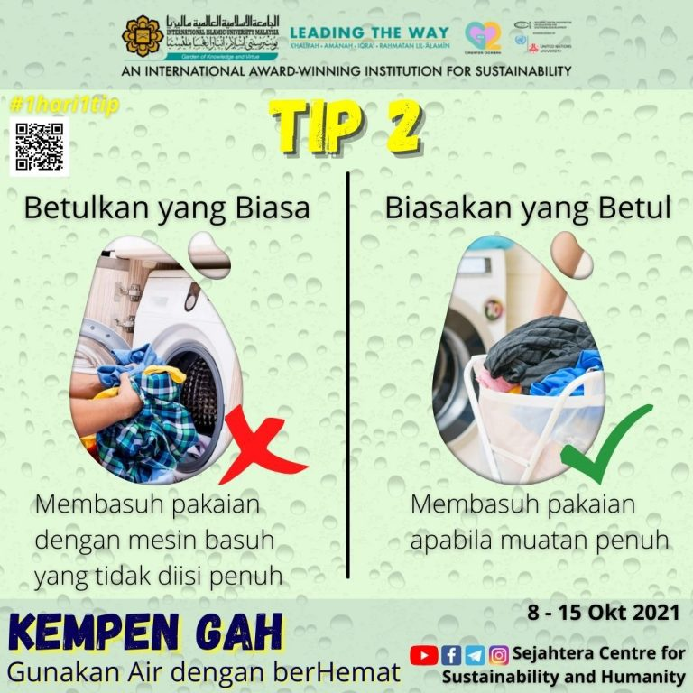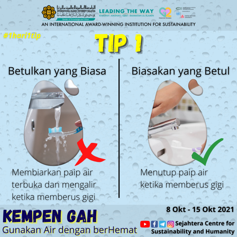 IIUM promotes conscious water use through the ongoing Sejahtera Centre’s Wise Water Usage campaign, which was launched in 2019 and runs until today. Known on campus as Kempen GAH. Guna Air dengan berHemat. Posters and visuals appear across common areas. Student and staff outreach runs through briefings and digital channels. SC4SH also shares reminders on its website and social media platforms. These simple nudges build daily habits that cut wastage and protect our shared resource.