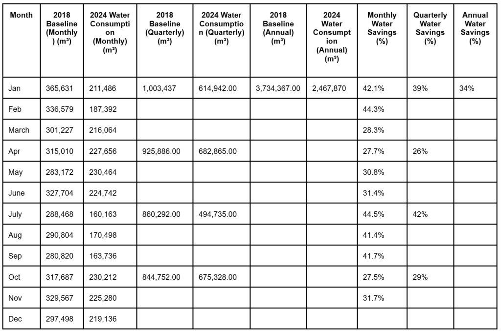 The data shows that IIUM Gombak achieved an overall 34% reduction in water consumption in 2024 compared to the 2018 baseline. Quarterly analysis indicates steady progress across all periods, with Q3 recording the highest water savings at 42%, followed by Q1 at 39%, Q4 at 29%, and Q2 at 26%. The most significant month-on-month reduction occurred in February (44.3%) and July (44.5%), reflecting effective conservation measures during these periods.