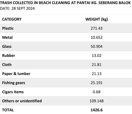 During the program, a total of 1,426 kg of trash was collected from the beach, highlighting the significant impact of plastic pollution and other waste on our coastal ecosystems.