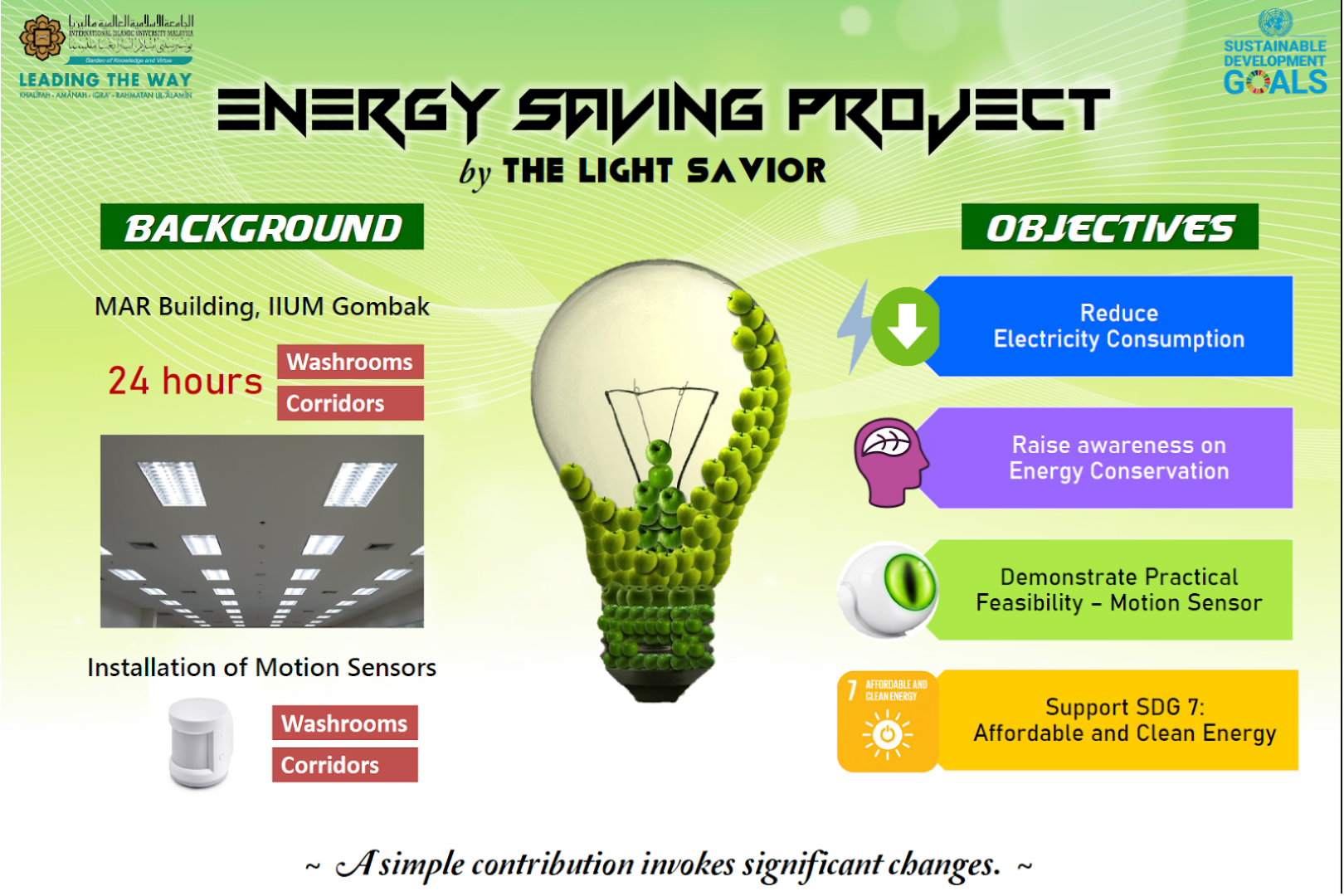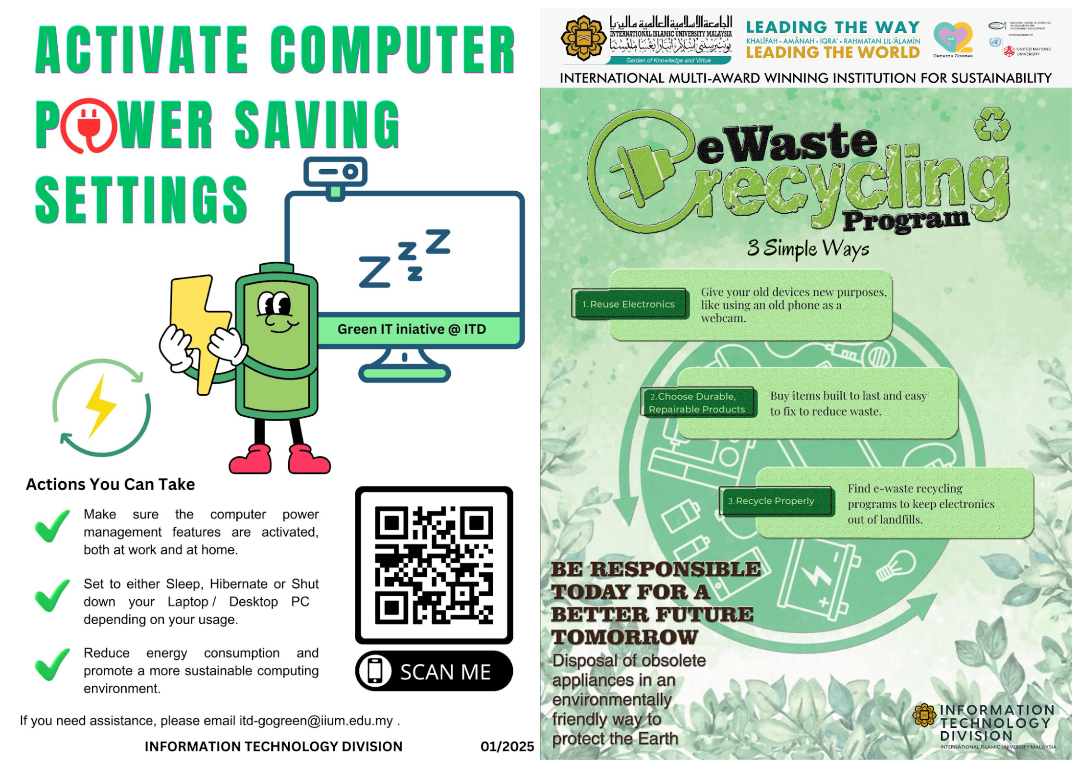 The International Islamic University Malaysia (IIUM) is dedicated to transforming its campuses into models of energy efficiency and sustainability. Through the implementation of advanced technologies and comprehensive energy-saving measures, IIUM has upgraded its facilities with high-efficiency chillers, power quality devices, and LED lighting systems across the Gombak and Kuantan campuses. The University also integrates renewable energy solutions, including solar lighting installations at the Pusat Pemulihan Dalam Komuniti (PDK), while promoting responsible energy practices through initiatives such as motion-sensor lighting and electricity-saving campaigns. These efforts have significantly reduced energy consumption, operational costs, and the University’s overall carbon footprint. By aligning with Malaysia’s Renewable Energy Roadmap and the global pursuit of SDG 7 (Affordable and Clean Energy), IIUM continues to strengthen its leadership in fostering eco-conscious, future-ready educational environments guided by the principles of Sejahtera and Islamic values.